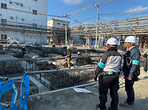 作業所に潜む「危ないかも?」を一つひとつ見つけ出し、事故を未然に防ぐためのパトロールを実施しています。 社員とパートナー企業がプロの視点で厳しくチェックを行い、誰もが安心して過ごせる「事故ゼロ」の作業所づくりを徹底しています。