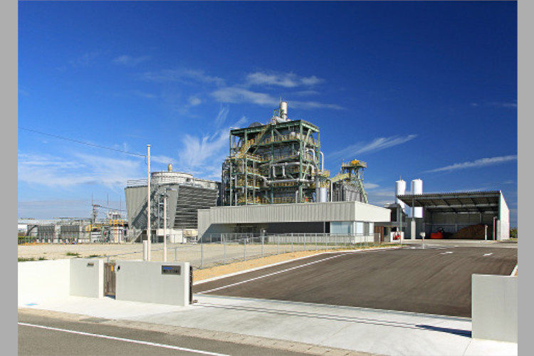 徳島工場の敷地内に地元間伐材を利用して、クラボウ様が独自で開発された高温に熱した砂で木質チップを瞬時に焼却出来る装置とボイラー、タービンを組み合わせた四国では初の木質バイオマスだけで発電する施設です。